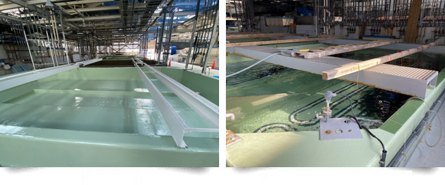府内水産技術センターにて1年前の1期工事に引き続き、魚類水槽の改修工事にビッグサンGR-J工法が採用されました。