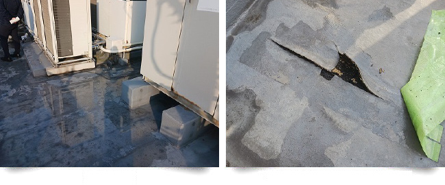 福岡県内の某自動車販売店の屋上にて、防水層のひび割れから漏水が発生している状況。ビッグサンで施工出来るか確認して欲しいと依頼があり、現場調査を行いました。